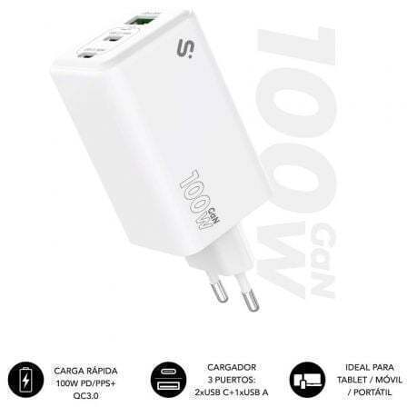 Potencia Total en Tamaño Compacto. El nuevo Cargador GaN de 100W SUBBLIM redefine la carga rápida con un diseño compacto, elegante y ultrapotente. Equipado con dos puertos USB-C Power Delivery y un puerto USB-A inteligente, es capaz de cargar simultáneamente hasta 3 dispositivos con una potencia total de 98W, distribuyendo de forma eficiente según las necesidades de cada equipo.