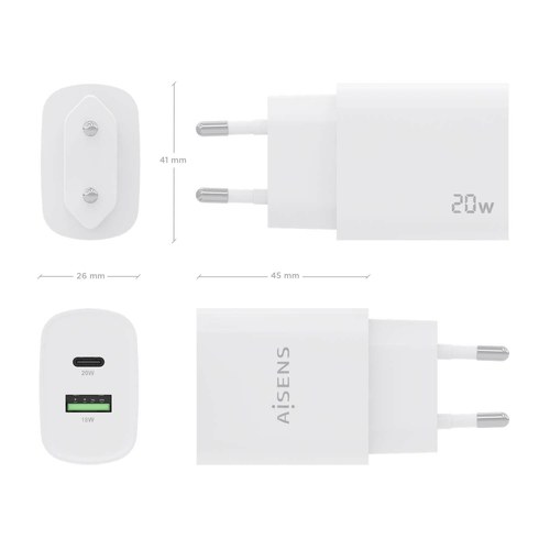 Cargador 20W, 1xUSB-C PD3.0, 1xUSB-A QC3.0, Blanco