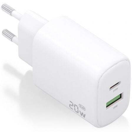 Cargador GaN 20W, 1xUSB-C PD3.0, 1xUSB-A QC3.0, Blanco