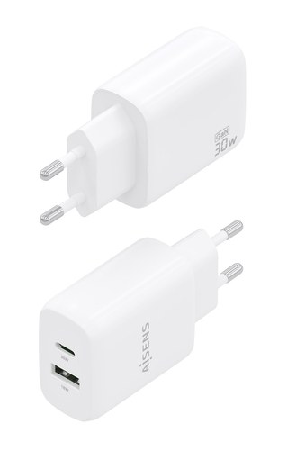 Cargador GaN 30W, 1xUSB-C PD3.0 QC4.0, 1xUSB-A QC3.0, Blanco