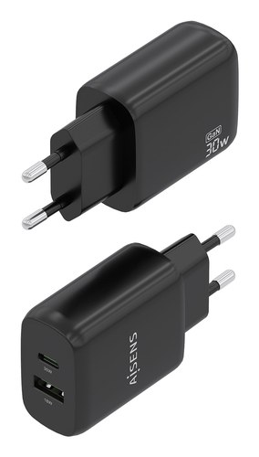 Cargador GaN 30W, 1xUSB-C PD3.0 QC4.0, 1xUSB-A QC3.0, Negro