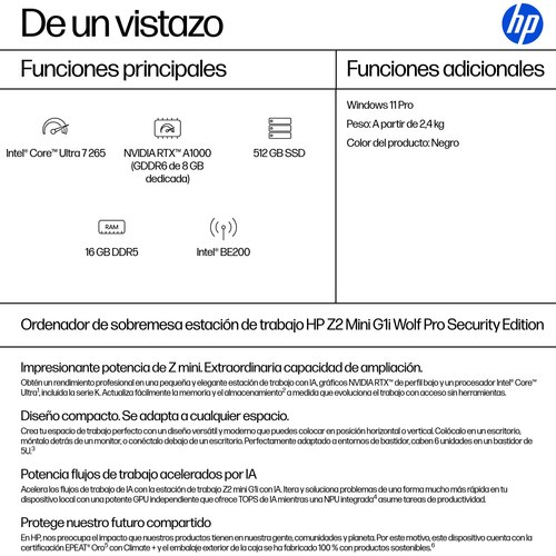 Ordenador de sobremesa estación de trabajo HP Z2 Mini G1i Wolf Pro Security Edition, Windows 11 Pro, Intel Core™ Ultra 7, 16GB RAM, 512GB SSD, RTX™ A1000, Negro, AI Workstation; AI PC