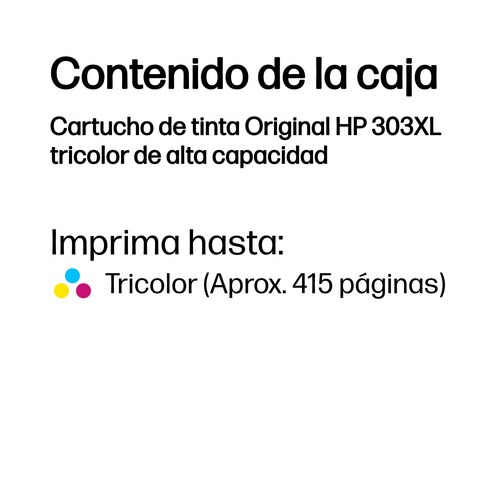 HP Cartucho de tinta Original 303XL tricolor de alta capacidad. Tipo de tinta de color: Tinta a base de colorante, Tipo de cartucho de tinta: Alto rendimiento (XL), Rendimiento de impresión de página con tinta de color: 415 páginas, Colores de impresión: