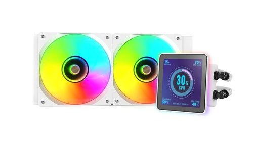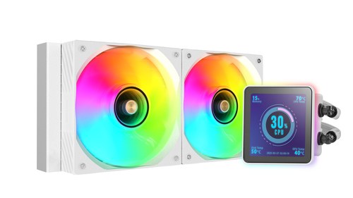 TDP 500W, Intel/AMD, ARGB, 2x 120 mm, 800-2300 RPM, 9-26 dBA, 27.2-76.6 CFM, PWM, 4" IPS, USB-C, 1189 g, Blanco