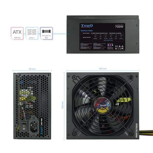 TooQ TQAPOLO-700SP. Potencia total: 700 W, Voltaje de entrada AC: 220 V, Frecuencia de entrada AC: 50 - 60 Hz. Alimentador de energía para tarjeta madre: 20+4 pin ATX, Longitud del cable de alimentación de la placa base: 45 cm, Longitud del cable de alime