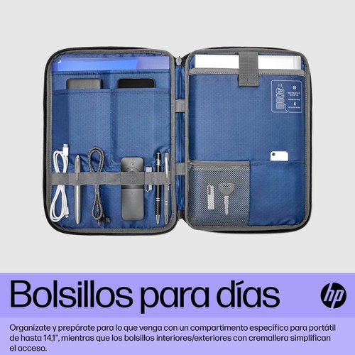 Con espacio para un portátil de hasta 14,1 pulgadas y para guardar el resto de tus accesorios en compartimentos independientes, esta funda para portátil te permite tenerlo todo organizado y estar listo para lo que sea, ya sea trabajar, resolver asuntos personales o viajar. Los bolsillos interiores y exteriores con y sin cremallera hacen que el acceso resulte muy sencillo, tanto para guardarlo todo fácilmente como para sacarlo en un instante.