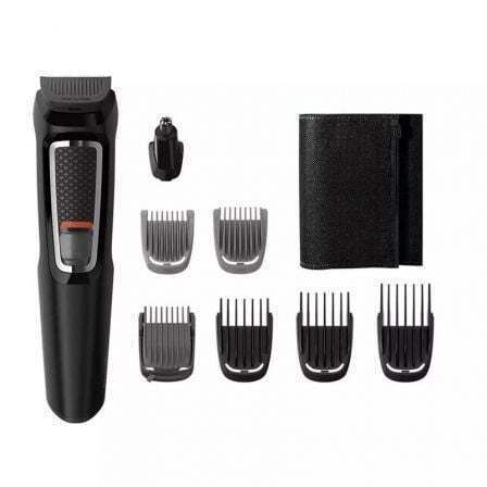 Este recortador todo en uno recorta y da forma cómodamente al pelo de la cara y el cabello.