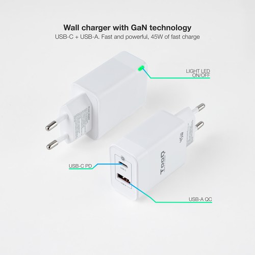Cargador de Pared GaN USB-C/PD + USB-A/QC 45W, Blanco