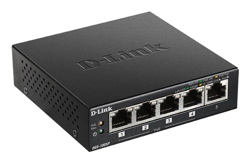 El switch de 5 puertos Gigabit D-Link DGS-1005P le permite conectar a la red de datos y alimentar con carga eléctrica a los dispositivos Power over Ethernet (PoE) como puntos de acceso Wi-Fi (AP), cámaras IP de vigilancia y teléfonos IP. Es un switch compacto, con carcasa metálica y funciona silenciosamente. Es Plug&Play, por lo que no requiere conocimientos técnicos.