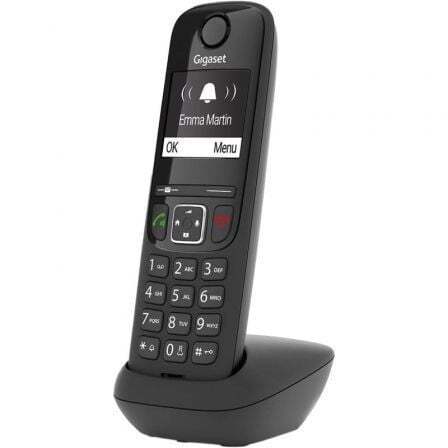 Lo primero que se nota sobre el Gigaset AS690 es su gran pantalla gráfica iluminada en blanco y negro. La pantalla tiene varias ventajas: la gran pantalla numérica en el modo de marcación y el fuerte contraste entre las letras blancas y el fondo negro se han diseñado para garantizar que el teléfono sea aún más fácil de usar. El teclado ergonómico con teclas iluminadas y el manejo intuitivo, también contribuyen a que hablar por teléfono sea lo más cómodo posible.