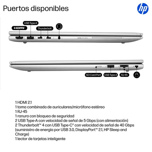 2 x Thunderbolt™ 4 (USB-C, 40 Gbps, Power Delivery, DisplayPort™ 2.1, HP Sleep and Charge)