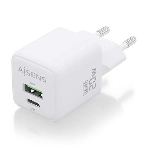 Cargador GaN 20W, 1xUSB-C PD3.0 QC4.0, 1xUSB-A QC3.0, Blanco