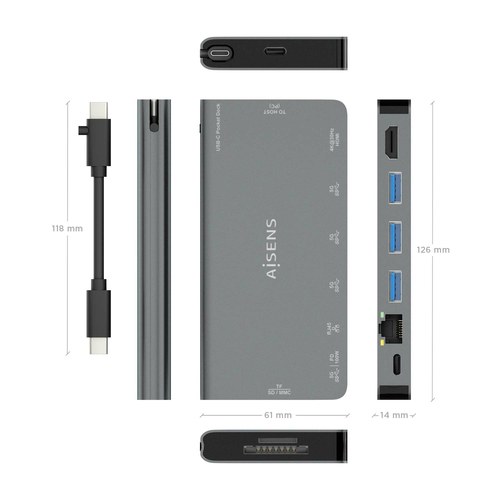 USB-C Dock 8 en 1, USB-C a 1xHDMI, 1xRJ45, 3xUSB-A, 1xUSB-C Datos+PD, 1xSD, 1xMicro SD, Gris, 10 cm