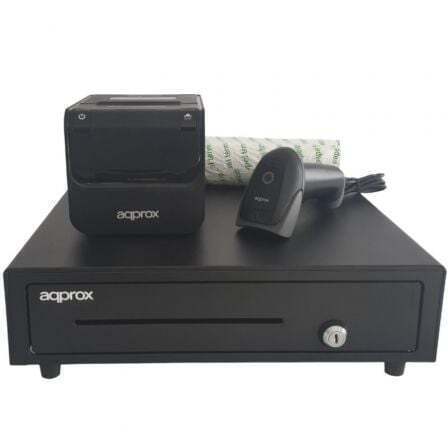 Consta de un cajón portamonedas estándar, una impresora térmica de tickets de 80 mm., un paquete de rollos de papel libres de bisfenol y un lector de códigos de barras 2D.