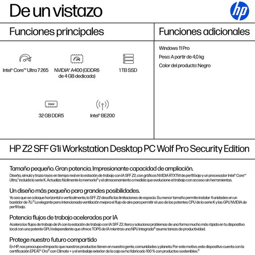 Z2 SFF G1i Workstation Desktop PC Wolf Pro Security Edition, Windows 11 Pro, Intel Core™ Ultra 7, 32GB RAM, 1TB SSD, RTX™ A400, Negro, AI Workstation; AI PC