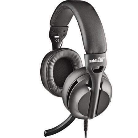 Auriculares estéreo de alta calidad con micrófono regulable en altura y plegable.