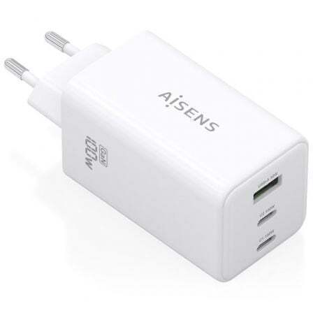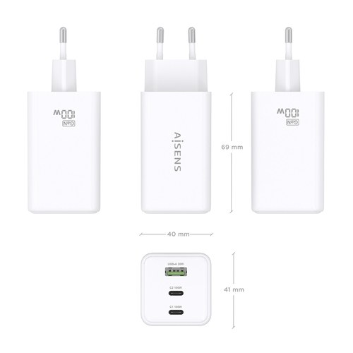 Cargador GaN USB-C 100W para cargar portátiles, móviles, cámaras y tablets etc. Diseño muy elegante, moderno y práctico.Este cargador cuenta con la tecnología GaN que ofrece una serie de ventajas, incluyendo una mayor eficiencia energética, menor generación de calor, mayor capacidad de corriente y menor tamaño y peso en comparación con los cargadores tradicionales de silicio. Estas ventajas hacen que los cargadores GaN sean una opción cada vez más popular para usuarios que buscan una carga más rápida, eficiente y sostenible. Tecnología AI (chip inteligente) incorporado que detecta el tipo de protocolo del dispositivo conectado para maximizar tanto la compatibilidad como la velocidad de carga. Cargue su dispositivo USB-C o USB-A de forma fácil y sencilla. Múltiples protecciones contra sobrecarga, cortocircuito, lo que garantiza la máxima seguridad para su dispositivo. Este cargador puede cargar simultáneamente 3 dispositivos USB-A y USB-C a máxima velocidad.