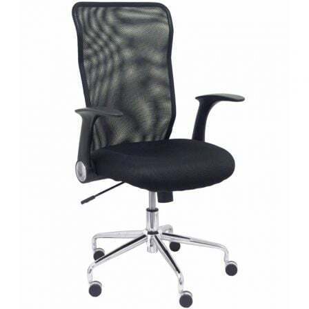 Silla de oficina Minaya con mecanismo Basculante tapizada con Tela color Negro. Equipada con Base cromada, Brazos abatibles y Ruedas de nailon 50 mm