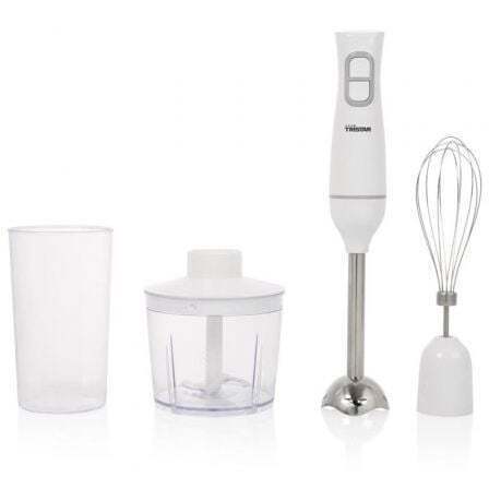Completa batidora de mano con picadora, varillas y vaso medidor. La batidora de mano tiene 350 W de potencia y varilla de acero inoxidable extraíble y fácil de limpiar. La picadora incluye cuchillas de acero inoxidable, perfectas para picar verduras.