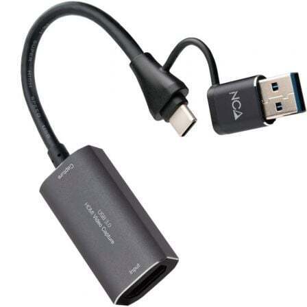 Capturadora de video HDMI conexión USB-C/USB-A macho y conexión HDMI hembra.