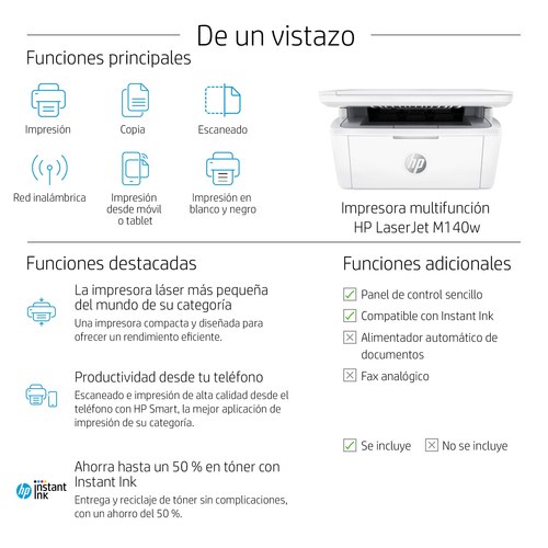 HP LaserJet M140w Inalámbrico Multifunction Blanco y negro Impresora, Fotocopiadora, escáner. Tecnología de impresión: Laser, Impresión: Impresión en blanco y negro, Resolución máxima: 600 x 600 DPI. Copiando: Copias en blanco y negro, Resolución máxima d