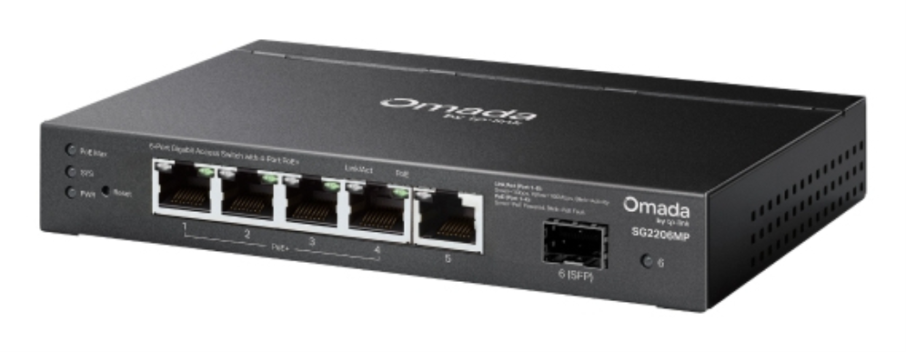 TP-Link SG2206MP. Capa del interruptor: L2. Puertos tipo básico de conmutación RJ-45 Ethernet: Gigabit Ethernet (10/100/1000), Cantidad de puertos básicos de conmutación RJ-45 Ethernet: 5, Número de módulos SFP instalados: 1. Tabla de direcciones MAC: 800
