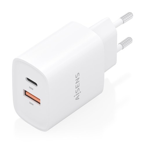 AISENS Cargador GaN 30W, 1xUSB-C PD3.0 QC4.0, 1xUSB-A QC3.0, Blanco. Tipo de cargador: Interior, Alimentación: Corriente alterna, Compatibilidad del cargador: Universal. Voltaje de entrada: 100 - 240 V, Voltaje de salida máximo: 12 V, Corriente de salid