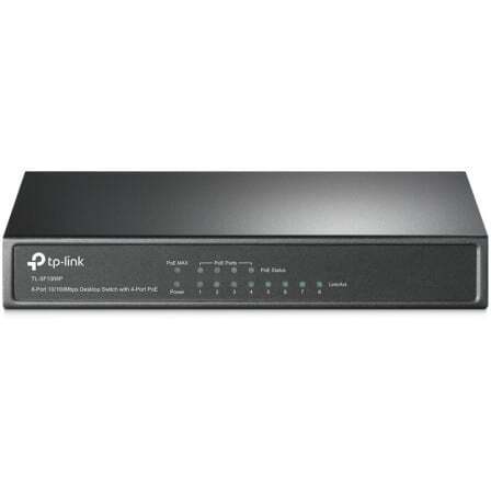 El TL-SF1008P es un switch no gestionable de 8 puertos 10 / 100Mbps que no requiere configuración y ofrece 4 puertos PoE (Alimentación sobre Ethernet). Puede detectar automáticamente y suministrar energía a todos los dispositivos de potencia (PDs) que cumplan con IEEE 802.3af. En esta situación, la energía eléctrica se transmite junto con los datos en un único cable que le permite ampliar su red hacia donde no hay enchufes, donde desea fijar los dispositivos tales como puntos de acceso, cámaras IP, teléfonos IP, etc.
