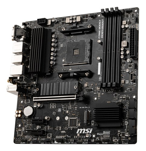 MSI B550M PRO-VDH WIFI. Fabricante de procesador: AMD, Socket de procesador: Zócalo AM4, Procesador compatible: AMD Ryzen 3000 Series. tipos de memoria compatibles: DDR4-SDRAM, Memoria interna máxima: 128 GB, Tipo de ranuras de memoria: DIMM. Interfaces d