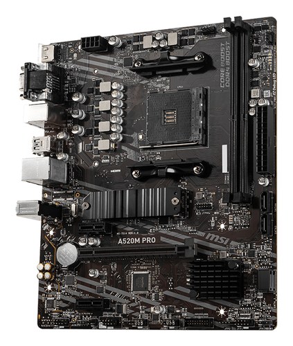 MSI A520M PRO. Fabricante de procesador: AMD, Socket de procesador: Zócalo AM4, Procesador compatible: AMD Ryzen 3000 Series. tipos de memoria compatibles: DDR4-SDRAM, Memoria interna máxima: 64 GB, Tipo de ranuras de memoria: DIMM. Interfaces de disco de
