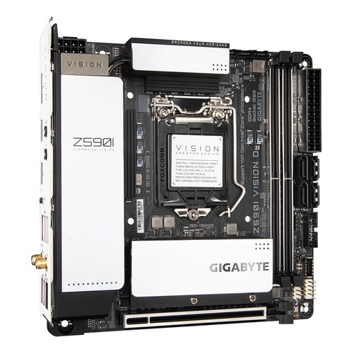 GIGABYTE Z590I VISION D. Fabricante de procesador: Intel, Socket de procesador: LGA 1200 (Socket H5), Procesador compatible: Intel® Celeron®, Intel® Core™ i3, Intel® Core™ i5, Intel® Core™ i7, Intel® Core™ i9, Intel® Pentium®. tipos de memoria compatibles
