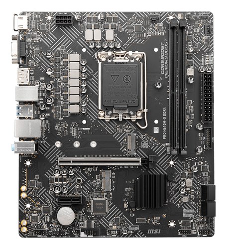 MSI PRO H610M-G DDR4. Fabricante de procesador: Intel, Socket de procesador: LGA 1700, Procesador compatible: Intel® Core™ i9. tipos de memoria compatibles: DDR4-SDRAM, Memoria interna máxima: 64 GB, Tipo de ranuras de memoria: DIMM. Interfaces de disco d