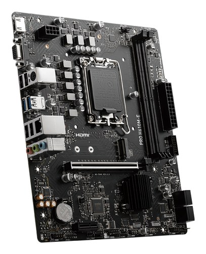 MSI PRO H610M-E. Fabricante de procesador: Intel, Socket de procesador: LGA 1700, Procesador compatible: Intel® Celeron®, Intel® Core™ i3, Intel® Core™ i5, Intel® Core™ i7, Intel® Core™ i9,.... tipos de memoria compatibles: DDR5-SDRAM, Memoria interna máx