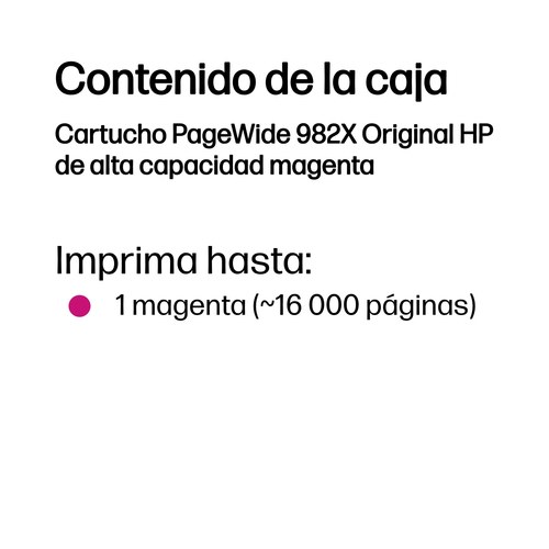 HP Cartucho PageWide 982X Original de alta capacidad magenta. Tipo de tinta de color: Tinta a base de pigmentos, Tipo de cartucho de tinta: Alto rendimiento (XL), Rendimiento de impresión de página con tinta de color: 16000 páginas, Volumen de tinta de co