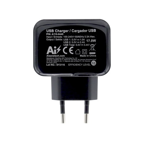 2x USB, 100 - 240 V, 50 / 60 Hz, 0.9 A, 17 W, 5 V, 3.4 A, Negro