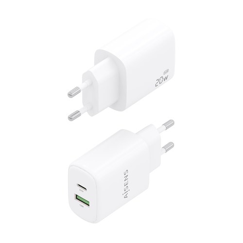 Cargador GaN 20W, 1xUSB-C PD3.0, 1xUSB-A QC3.0, Blanco