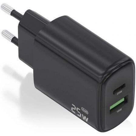 Cargador GaN 25W, 1xUSB-C PD3.0, 1xUSB-A QC3.0, Negro