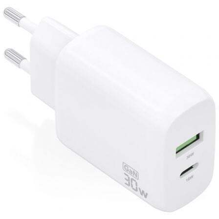 Cargador GaN 30W, 1xUSB-C PD3.0 QC4.0, 1xUSB-A QC3.0, Blanco