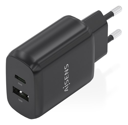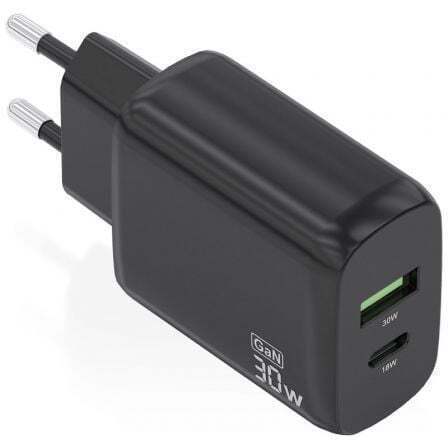 Cargador GaN 30W, 1xUSB-C PD3.0 QC4.0, 1xUSB-A QC3.0, Negro