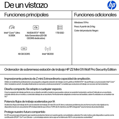 Ordenador de sobremesa estación de trabajo HP Z2 Mini G1i Wolf Pro Security Edition, Windows 11 Pro, Intel Core™ Ultra 9, 48GB RAM, 1TB SSD, NVIDIA RTX™ 4000 Ada, Negro, AI Workstation; AI PC