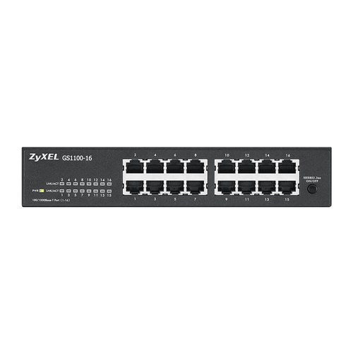 Zyxel GS1100-16. Tipo de interruptor: No administrado. Puertos tipo básico de conmutación RJ-45 Ethernet: Gigabit Ethernet (10/100/1000), Cantidad de puertos básicos de conmutación RJ-45 Ethernet: 16. Tabla de direcciones MAC: 8000 entradas, Capacidad de