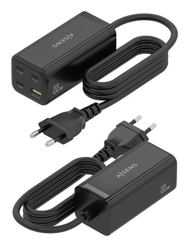 Cargador Sobremesa GaN 100W, 3x USB-C PD3.0 QC4.0 QC5.0, 1x USB-A QC3.0, Negro