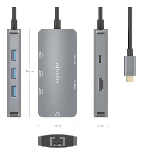 AISENS USB-C Dock 6 En 1, USB-C a 1xHDMI, 1xRJ45, 3xUSB-A, 1xUSB-C PD, Gris, 15cm. Tecnología de conectividad: Alámbrico, Interfaz de host: USB 3.2 Gen 1 (3.1 Gen 1) Type-C, Entrega de energía USB (USB Power Delivery) de hasta: 100 W. Ethernet LAN, veloci