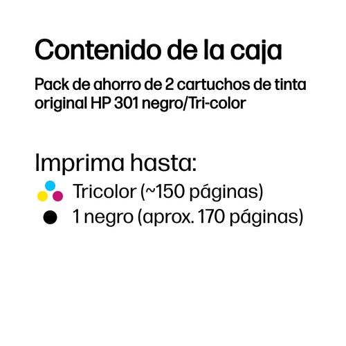 HP Pack de ahorro de 2 cartuchos de tinta original 301 negro/Tri-color. Tipo de tinta de color: Tinta a base de colorante, Tipo de cartucho de tinta: Rendimiento estándar, Tipo de tinta negra: Tinta a base de pigmentos, Volumen de tinta negra: 3 ml, Tipo