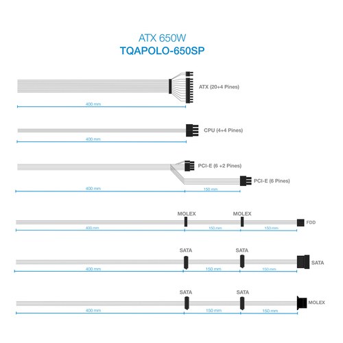 TooQ TQAPOLO-650SP. Potencia total: 650 W, Voltaje de entrada AC: 220 V, Frecuencia de entrada AC: 50 - 60 Hz. Alimentador de energía para tarjeta madre: 20+4 pin ATX, Longitud del cable de alimentación de la placa base: 40 cm, Longitud del cable de alime