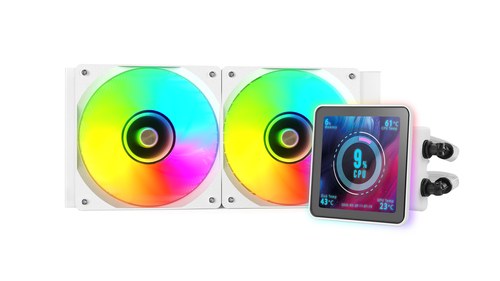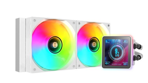 TDP 500W, Intel/AMD, ARGB, 2x 120 mm, 800-2300 RPM, 9-26 dBA, 27.2-76.6 CFM, PWM, 4" IPS, USB-C, 1189 g, Blanco