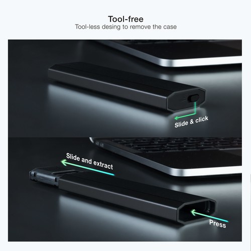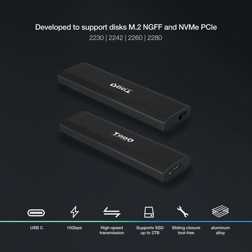 M.2, NGFF, NVMe, SSD, USB C, USB 3.1 Gen2, 10 Gbps, 32 x 115 x 12 mm, 42 g, Negro