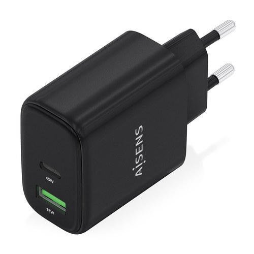 AISENS Cargador GaN 45W, 1xUSB-C PD3.0 QC4.0, 1xUSB-A QC3.0, Negro. Tipo de cargador: Interior, Alimentación: Corriente alterna, Compatibilidad del cargador: Cámara digital, GPS, Teléfono móvil, Portátil, Smartphone, Tableta, Universal. Voltaje de entrada