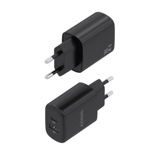 Cargador GaN 30W, 1xUSB-C PD3.0 QC4.0, 1xUSB-A QC3.0, Negro