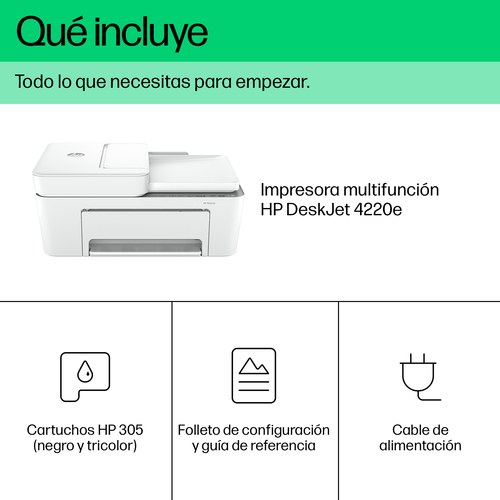 HP DeskJet 4220e Inalámbrico All-in-One Color Impresora, Instant Ink; Fotocopiadora, escáner. Tecnología de impresión: Inyección de tinta térmica, Impresión: Impresión a color, Resolución máxima: 4800 x 1200 DPI, Velocidad de impresión (color, calidad nor